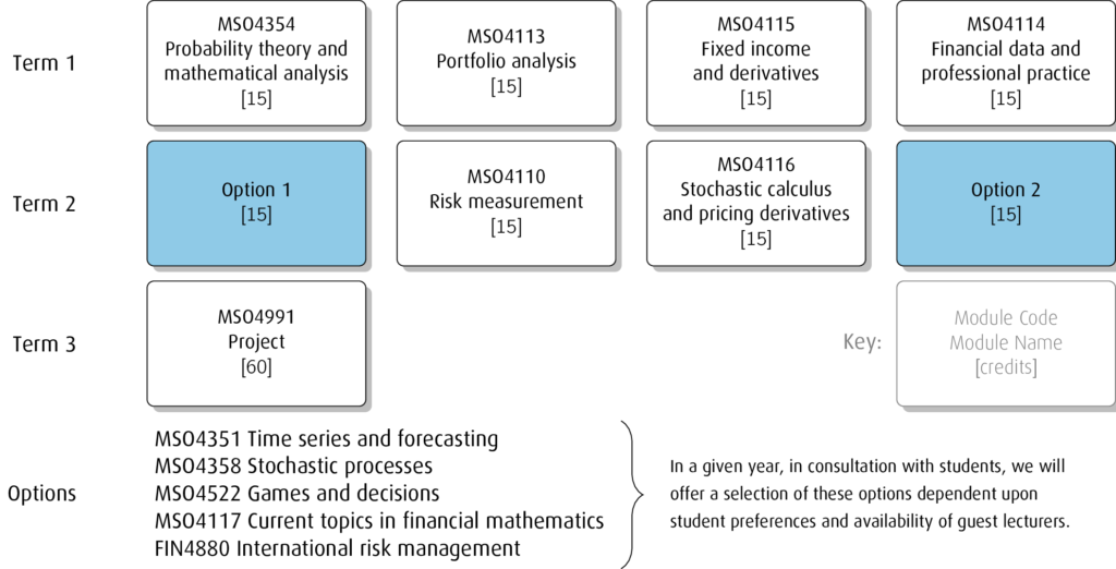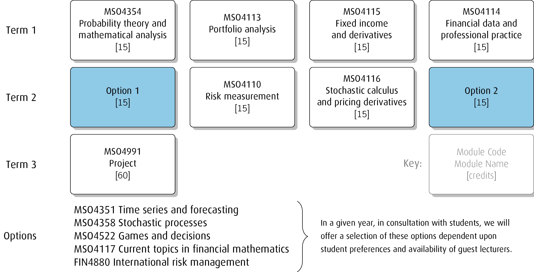 - Throughout the course you will gain access to academic and professional talks, training and networking events on campus and in the financial heart of London. In the optional module MSO4117 Current topics in financial mathematics you can write about these talks for credit towards your MSc/PGDip.