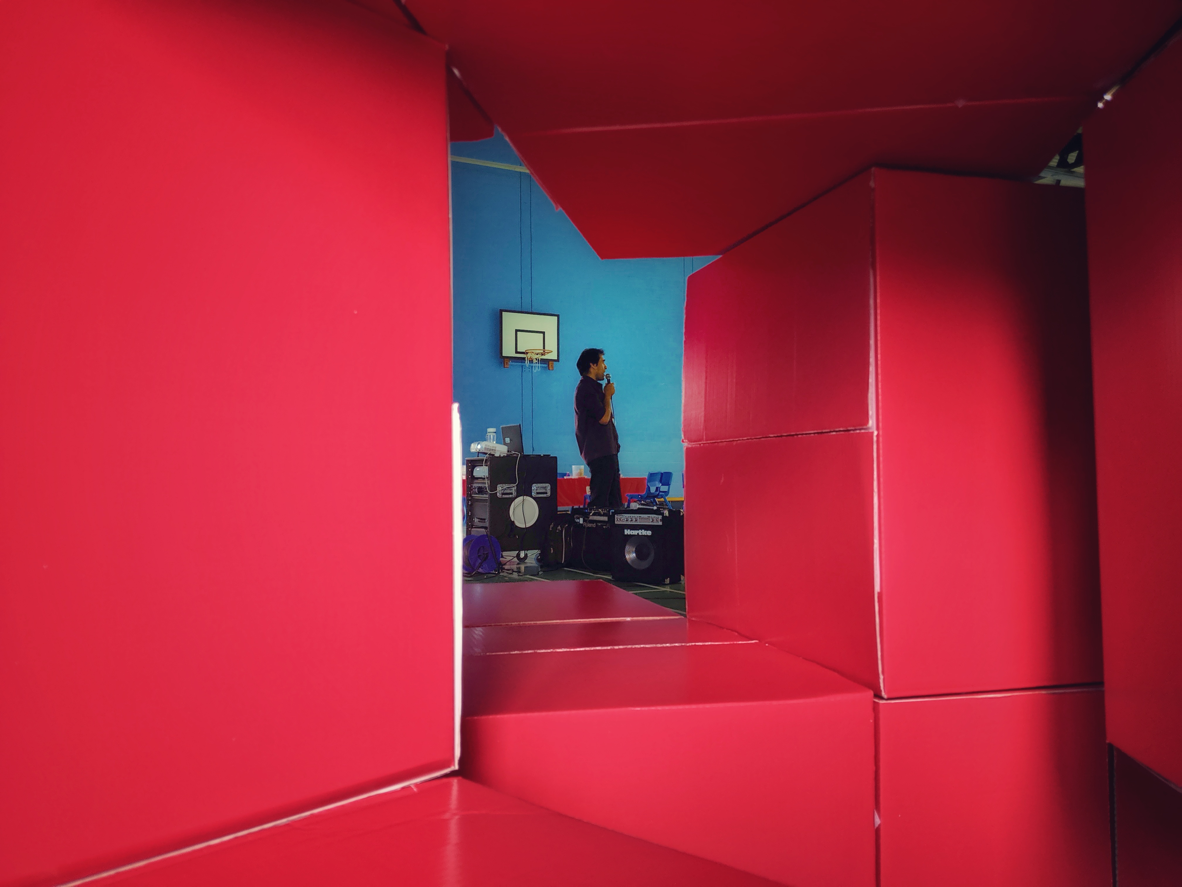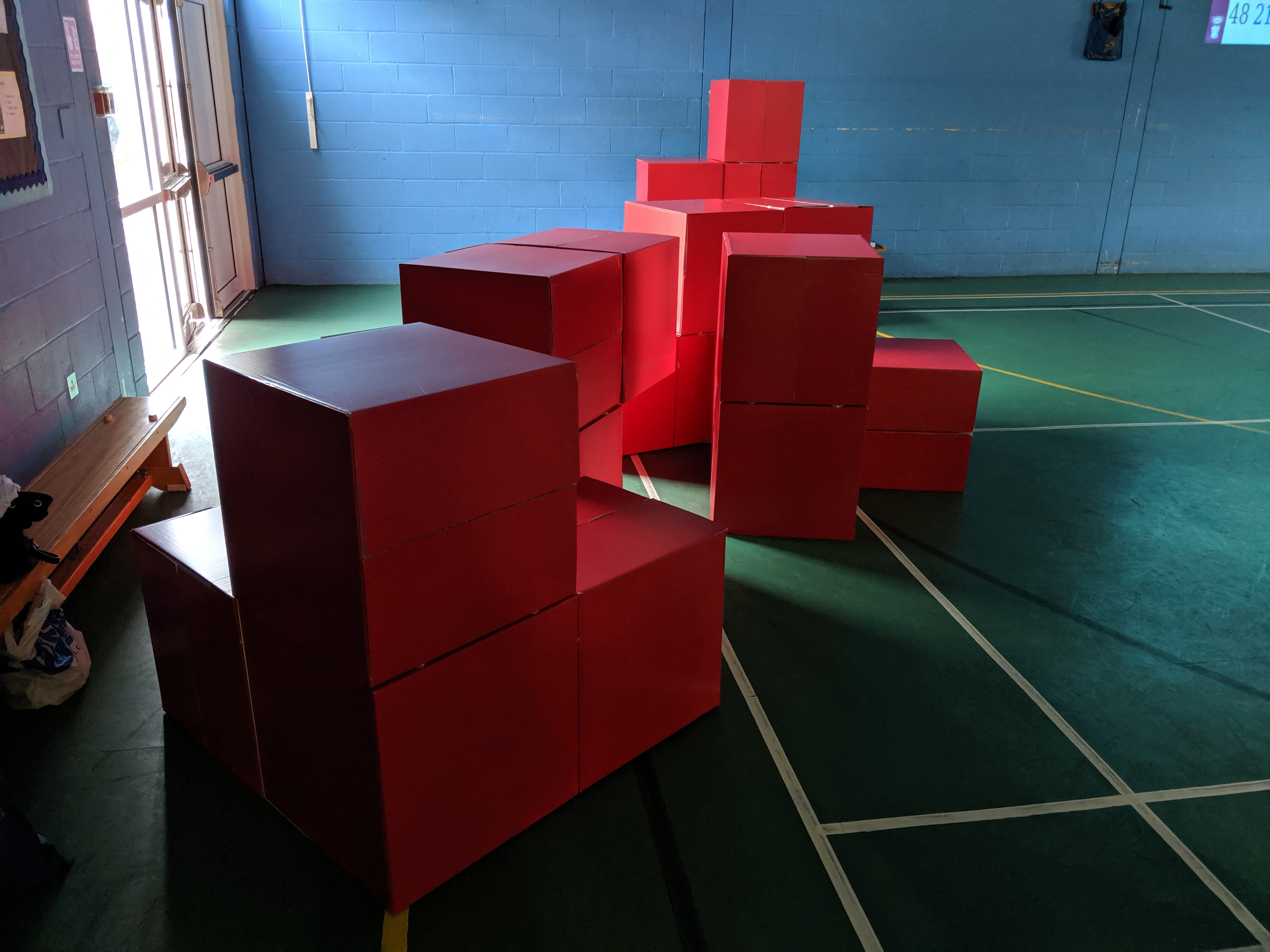 A giant version of the Soma Cube puzzle, using seven geometrical pieces to build a cube and other shapes.