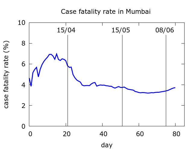 One crude way to see that something is not right is to look at Mumbai’s case fatality rate (CFR). Initial random fluctuation when fatalities are low is normal, but then CFR starts to drop steadily from early-mid April. CFR was dropping as the epidemic raged, and this is not normal. The recent small rise from late May onwards slightly reverses the trend, but has not cancelled out the large unexplained drop.
