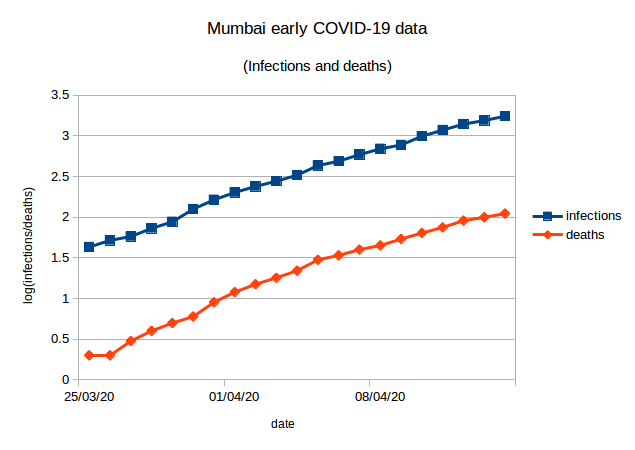 Mumbai’s early data (25th March to April 14th) is very “clean”. Simple exponential growth in both cases and fatalities as we see in the next figure.