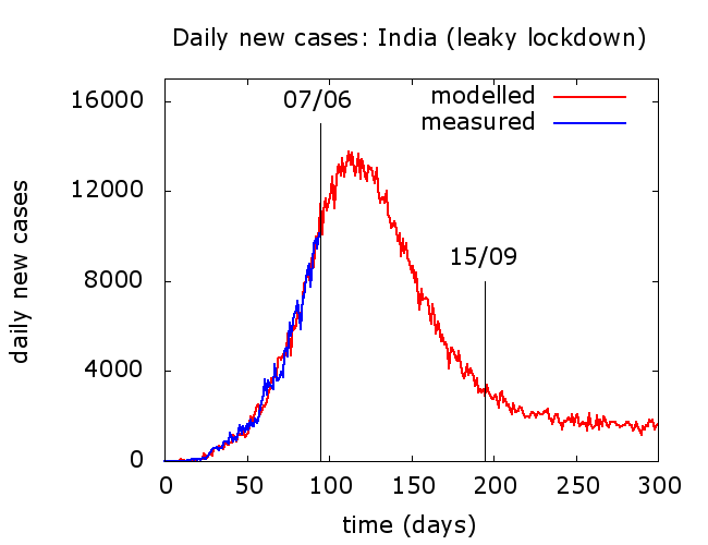 When we model the Indian data, we find that there are many plausible futures for the outbreak, consistent with its evolution so far. These give us insight into what might happen, but no firm answers. We can infer that recent predictions about the end of the epidemic must be based on naive assumptions. In Figure 7 are plots from a simulation whose outputs reasonably match Indian recorded infections to date (taken to be a constant fraction of total infections tested around a particular moment in the disease cycle). It is important to clarify that this is by no means a “prediction”. It is just a simulation consistent with the data so far, and has been chosen to illustrate a point.