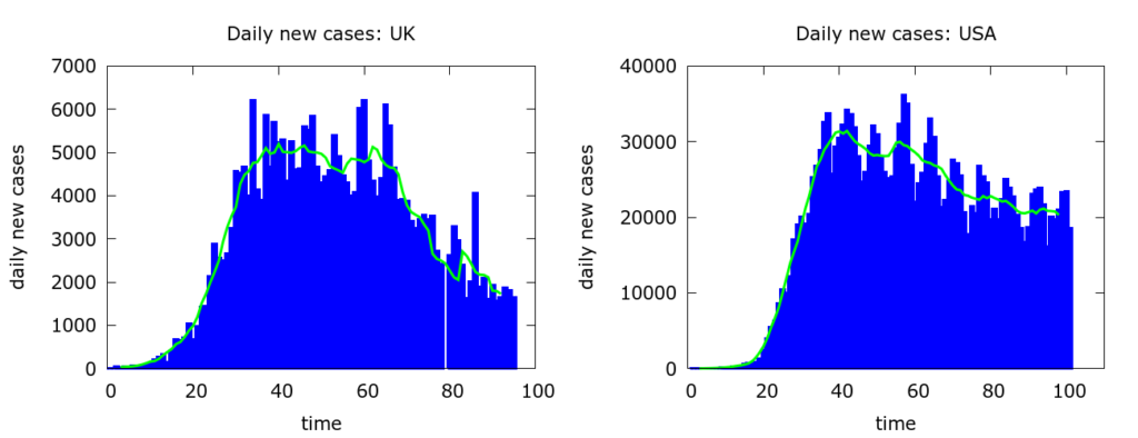 Despite random fluctuations and other effects created by how and when cases get detected and reported, we clearly see the relatively rapid rise and the relatively slow decline in the numbers. The rise is equally steady, but the decline even slower and more uncertain, in countries which have been less successful at mitigation such as the UK and the USA (Figure 3).