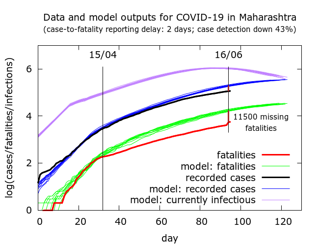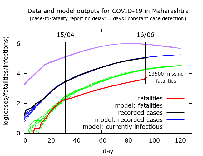 In every case the recorded data is taken from https://www.covid19india.org/. The key quantity which varies between simulations is the “case-to-fatality reporting delay” or “C-F delay” for short discussed previously. This is the difference between the time_to_death and testdate parameters. As this is increased, we need to lower case detection in order to match the early cases and fatalities data. Other parameters are tweaked to get a better visual match between the modelled and measured data. All matching is currently by eye – no optimisation is carried out, although this is intended in the future.