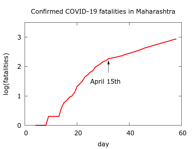Figure 1. Maharashtra’s COVID-19 fatality data from https://www.covid19india.org/. An immediate drop in the rate of increase of fatalities occurred following the change in protocol for recording COVID-19 deaths in Mumbai on 15/04/2020.