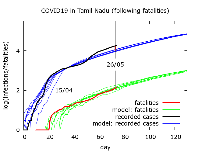 Thus increased testing could explain some of the discrepancy between expected and observed fatalities in both regions. Let’s examine this possibility by “trusting” the fatality figures and using these to predict recorded infections based on a constant case detection rate. If we slightly adjust the parameter values used for simulations of the Tamil Nadu data in Figure 2 so as to match the observed fatality data, we now obtain plots like that in Figure 3.