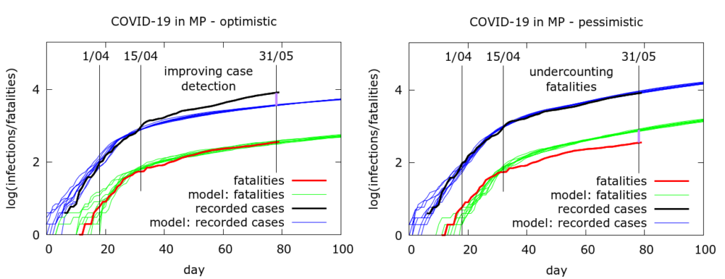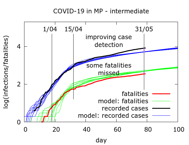 It is also worth indicating what an “intermediate” scenario between optimistic and pessimistic ones looks like. The results of simulating such a scenario are shown in Figure 3. In this scenario, some of the drop in case fatality can be explained by improved case detection, and some of it by missing deaths.