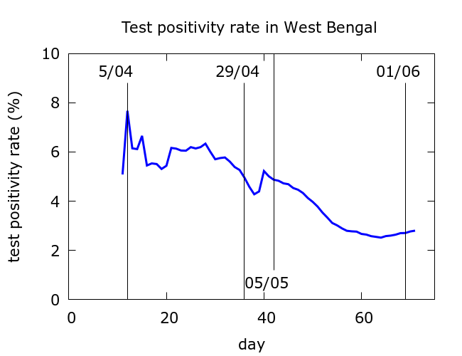 So, which of these scenarios is closer to the truth? We can look to see if case detection might have risen in West Bengal as in the optimistic scenario. Our only hope of getting insight into how case detection might be changing using the available data is to examine the test positivity rate over time (Figure 3). Test positivity has, indeed fallen quite considerably in West Bengal, first during April, and then again, after the correction in fatalities, during May. It is possible that, indeed, case detection has improved significantly and this partly explains the decline in CFR.