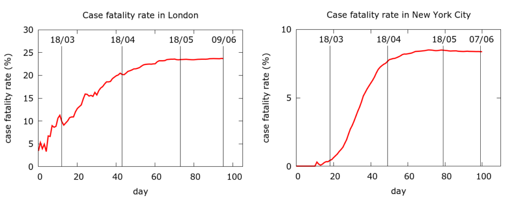 By contrast, here are CFR curves for London and New York City (data from Wikipedia), both of whose epidemics have wound down.
