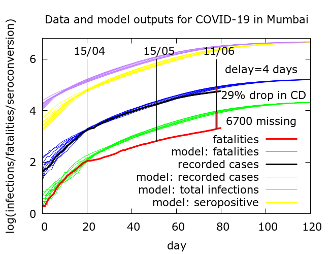 One crude way to see that something is not right is to look at Mumbai’s case fatality rate (CFR). Initial random fluctuation when fatalities are low is normal, but then CFR starts to drop steadily from early-mid April. CFR was dropping as the epidemic raged, and this is not normal. The recent small rise from late May onwards slightly reverses the trend, but has not cancelled out the large unexplained drop.