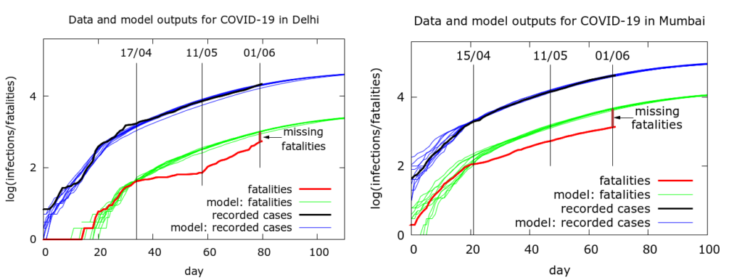 Note that Delhi also had a very similar data anomaly to Mumbai’s – infections were no longer correctly predicting deaths. It turned out that in Delhi the story was quite simple – COVID-19 deaths were not being recorded in the official count. However, once this started to be rectified, the anomaly got smaller. It remains, but is much diminished. The next figure is from an earlier comparison of the two cities. We see in Delhi (left) the growing and then diminishing divergence between expected and obtained fatalities. In Mumbai (right) on the other hand, we had already noted that there is no such “correction” occurring.
