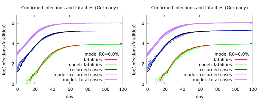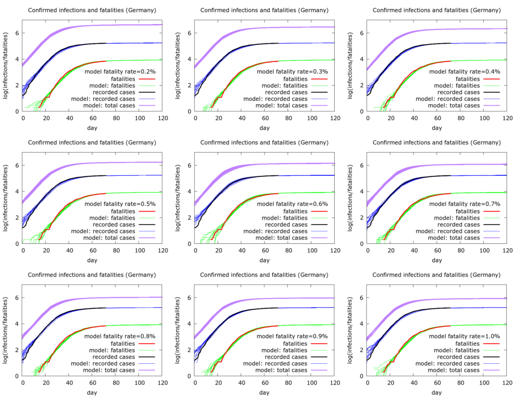 So, for example, with a fatality rate of 1.0%, total current infections (as of May 7th 2020) number about 800,000, roughly five times recorded infections. In this scenario only about 1% of the German population has so far been infected, and testing is picking up about 20% of infections. At the other end of the spectrum, with a fatality rate of 0.2%, total infections number about 4 million, namely about 25 times recorded infections. In this scenario, about 5% of the German population has been infected, and testing is picking up only 4% of infections or so. Note that in none of these scenarios is there sufficient herd immunity to slow the pandemic nationally, although the picture might be different locally. For a significant degree of herd immunity to have developed nationally, the fatality rate would have to be exceedingly low – below 0.1%.