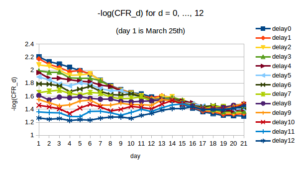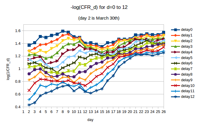 We can try to do this by looking at the variation in CFR_d during the early period for different values of C-F delay d. In the next figure we plot -log(CFR_d) for d = 0 … 12. We are interested in the period from March 30th (day 2 in the plot) to April 10th (day 13 in the plot). If CFR_d is approximately constant over this period, then we can say that fatalities were well-predicted by cases d days earlier. We note, by eye, that the curves are flatter for some values of d than others.