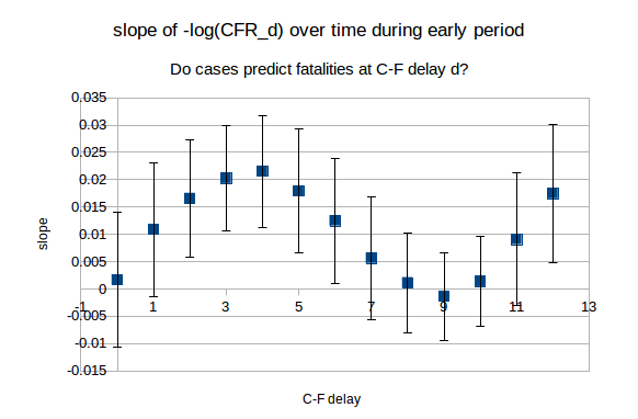 We see that for d = 0, 1, 7, 8, 9,10 and 11, the 95% CIs include 0. The calculated slope is smallest in magnitude for d = 8, 9 and 10, and so is the standard error on this slope. This provides some evidence that cases predict deaths with greater accuracy (during the early period) if we use a longer C-F delay. This would imply that it is the higher end figures for prevalence and fatality undercounting in which we should place greater trust.