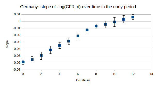 I decided to add into this document some analysis of Germany’s data in the same vein as the analysis above to provide some comparison with the Indian situation. The methodology is the same: the basic idea is to use early data to estimate C-F delay and see whether we come to the conclusion of underreporting of deaths. The size and number of blocks of data used are the same as in the Indian case.
