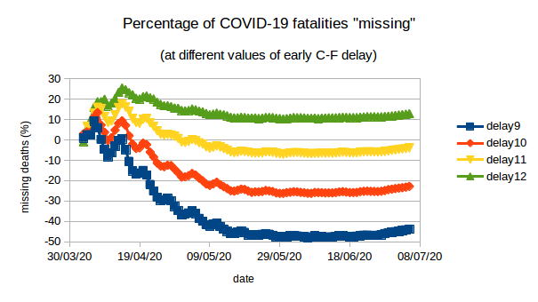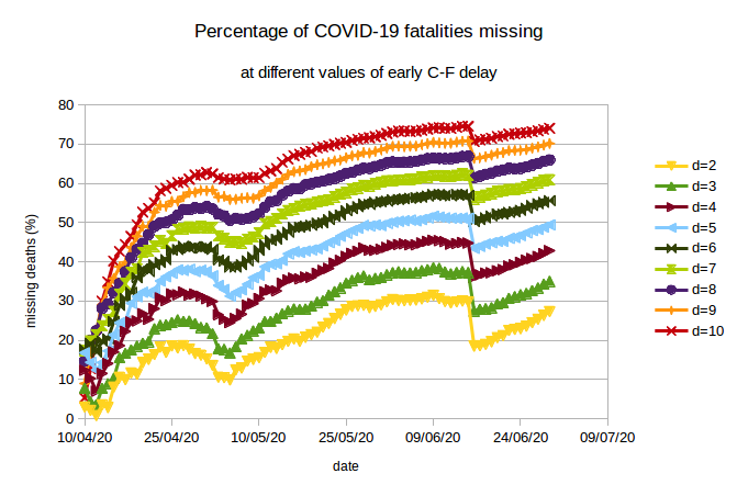 Estimates of delayed case fatality rates and missing fatalities at the end of June. Here are the values of CFR_d to 3 s.f. estimated from early data for d = 0, …, 12 respectively: 3.26%, 3.79%, 4.39%, 5.11%, 6.02%, 7.06%, 8.35%, 9.82%, 11.6%, 13.8%, 16.4%, 19.7% and 23.6%. Estimated fatalities on a given day can be calculated by multiplying CFR_d by cases from d days earlier. Using these numbers we get estimates for fatalities on June 29th for d = 0, …, 12 as: 18492, 20833, 23263, 26022, 29572, 33412, 38065, 43256, 49634, 56623, 65098, 75162, and 86780. There were 16,904 recorded fatalities on June 29th, so undercounting ranges from 8.6% (at d=0) to 80.5% (at d=12).