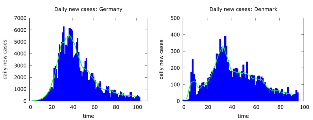 Let’s first be clear about one thing: COVID-19 is, in general, not obeying Farr’s law. In Figure 2 are the daily new cases for two countries which have been relatively successful in dealing with their COVID-19 outbreaks: Germany and Denmark.