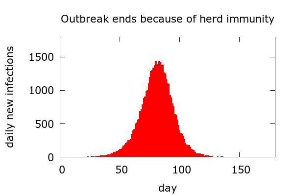 Herd immunity. First (no surprise here) an outbreak can end because herd immunity develops. A simulation of a simple herd immunity scenario is presented in Figure 4.