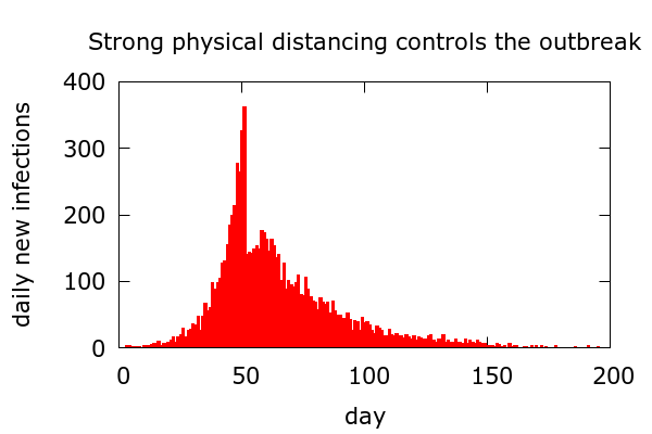 Physical distancing. A second toy scenario for how a COVID-19 outbreak can end is because of the introduction of strong “physical distancing”. This should be read in a general sense to include increased hygiene, mask wearing, and all behaviours which reduce events of the kind which spread infection – including contact tracing followed by isolation. A simulation of a scenario with the sudden introduction of physical distancing is shown in Figure 5.