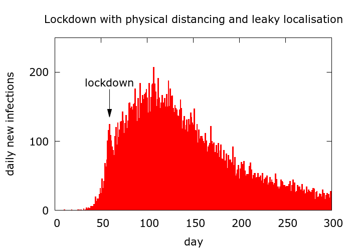In Figure 6 is a simulation of a more realistic lockdown scenario, in which both physical distancing and disease localisation occur and, moreover, there is leak (after a short delay) into the infectible population.