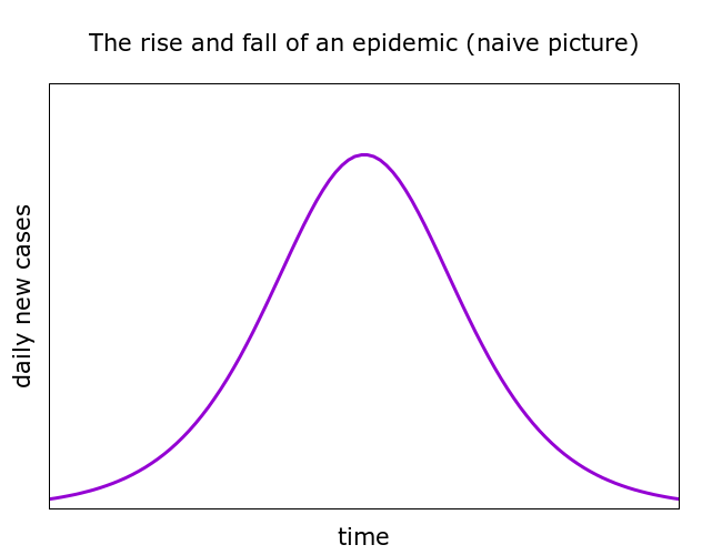 It’s useful to start by thinking about what COVID-19 doesn’t do. Naive modelling of epidemics is often accompanied by pictures which look something like Figure 1.