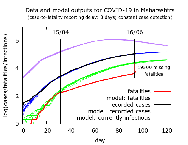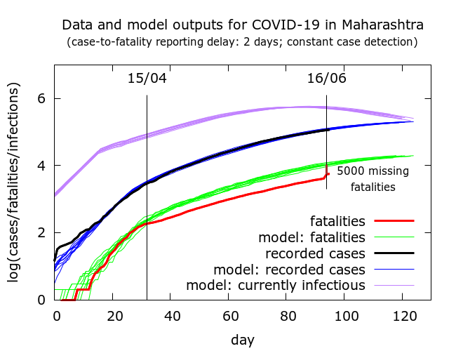 In every case the recorded data is taken from https://www.covid19india.org/. The key quantity which varies between simulations is the “case-to-fatality reporting delay” or “C-F delay” for short discussed previously. This is the difference between the time_to_death and testdate parameters. As this is increased, we need to lower case detection in order to match the early cases and fatalities data. Other parameters are tweaked to get a better visual match between the modelled and measured data. All matching is currently by eye – no optimisation is carried out, although this is intended in the future.