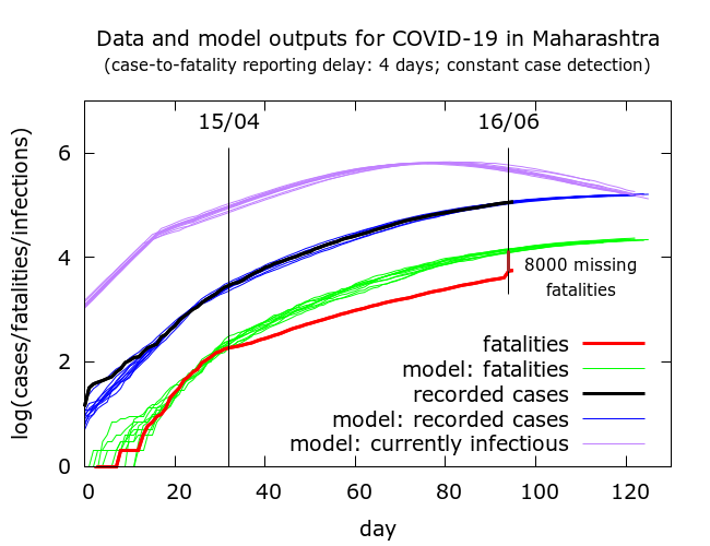 Below are plots from simulations used to estimate the scale of missing COVID-19 fatalities in Maharashtra. The agent-based modelling framework is described at /research/modelling-the-covid-19-pandemic/, with code at https://github.com/muradbanaji/COVIDAGENT. Parameter values are given in the Appendix.