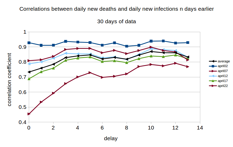 Is it possible to decide which out of “Scenario 1” and “Scenario 3” is closer to the truth? One crude, but simple, way is to examine the correlations between daily new deaths and daily new infections in the data. We took five blocks of daily fatality data, each 30 days long, beginning, respectively, on April 2nd, 7th, 12th, 17th and 22nd, and examined the correlations between these data-sets and daily new cases data from n days previously where n varied from 0 to 13. The outcomes are shown in Figure 3. We see the maximum correlation occurring with a delay of 10 days, although there also appears to be a more minor peak at a delay of around 5 days.
