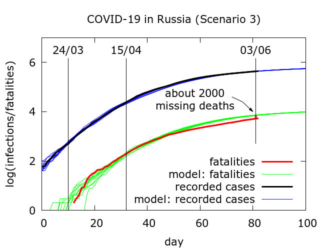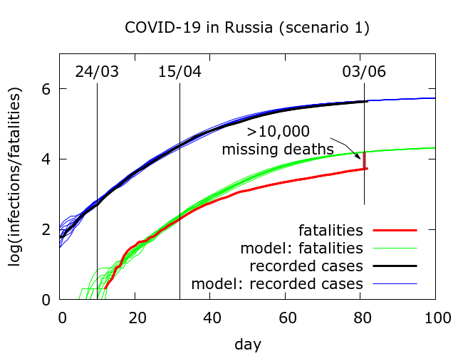 A recent Guardian article cast doubts over the accuracy of Russian COVID-19 fatality figures. An earlier article had also noted that “Moscow’s health department revealed that more than 60% of deaths of coronavirus patients in the capital were not tallied in the city’s official death count from the disease because an autopsy showed they had died of other causes.” Thus there is evidence of COVID-19 fatality undercounting in Russia. I wanted to see if modelling supported these claims of fatality underreporting, or whether it gave results consistent with the claim that the relatively low Russian death toll is a consequence of a mass testing regime and rapid response to confirmed cases.