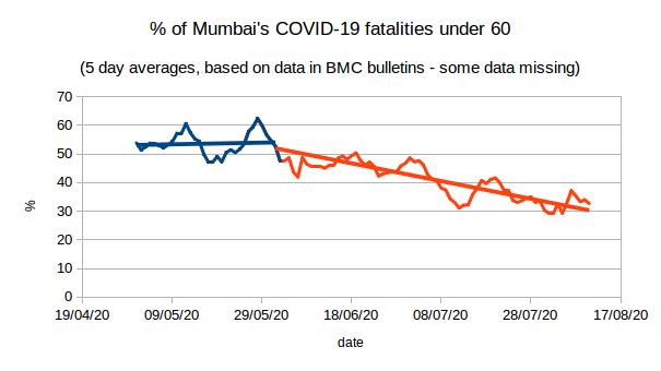 Earlier, this anomaly was even more pronounced: during May, a full 54% of all COVID-19 deaths in the city were in the under-60s. Only in June did this proportion start to decline, approaching 30% in early August. This very pronounced change provides more circumstantial evidence of COVID-19 spreading in a younger (slum) population during April and May, and gradually moving to an older (non-slum) population from June onwards.