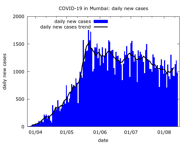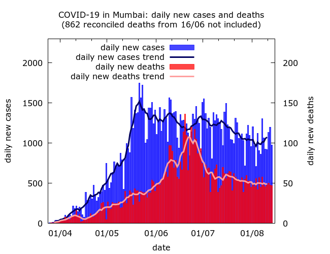 One side-effect of the reconciliation was to make tracking COVID-19 deaths in Mumbai much harder. Omitting the single day spike in reconciled deaths on June 16 gives an apparent peak in fatalities in late June, but the true peak was probably earlier and less pronounced. What is clear is that the decline in deaths – like that of cases – has been slow.