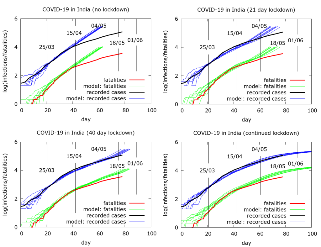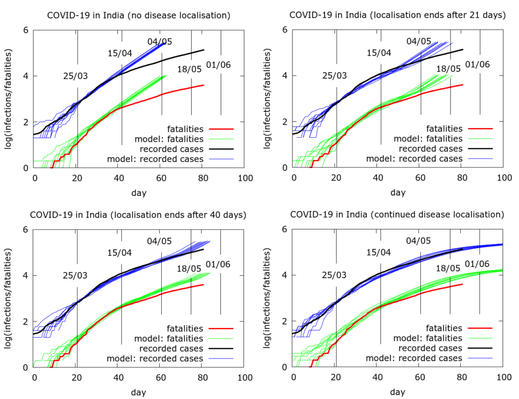 An attempt to quantify the effects of disease localisation is presented in the simulation in Figure 4. All the simulations use a model fatality rate of 0.5% and we consider the time to get to 20 million infections under different scenarios. With full and continuing lockdown, there have so far (as of May 22nd 2020) been a total of about 3 million infections nationwide, heavily concentrated in a few hotspots. Testing has picked up about 4% of these and about a third are currently infectious. Infections do not reach 20 million by the end of the simulation (Figure 4, bottom left). With no localisation, i.e., with physical distancing at pre-lockdown levels, but no “lockdown” as such, total infections would already have reached about 20 million by about May 5th (Figure 4, top left). If lockdown had ended after the first phase (April 15th), this figure would have been reached around mid-May (Figure 4, top right). A forty day lockdown would delay the time to 20 million infections by another ten days or so (Figure 4, bottom left). The parameter values used to generate the pictures in Figure 4 are given in the Appendix.