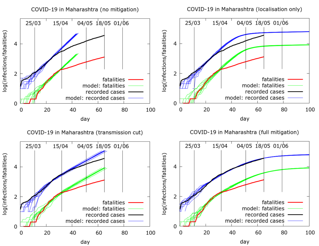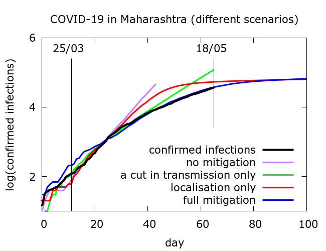 Simulation allows us to try and disentangle the twin effects of enforced social distancing, and geographical localisation on disease progression. Figure 2 includes confirmed infections data from Maharashtra at https://www.covid19india.org/ along with typical trajectories from simulations with (i) no mitigation; (ii) some physical distancing but no disease localisation; (iii) disease localisation but no additional physical distancing and (iv) both effects. In all cases, for computational reasons, simulations were stopped if total infections (not shown) reached 10 million. All of the modelled curves follow the data until about 10 days after lockdown begins, after which they diverge, but in rather different ways.