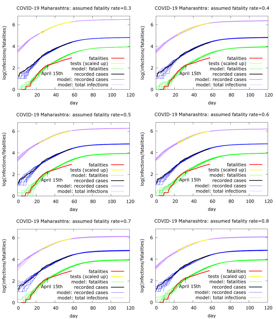 What does change with the fatality rate is the model estimated total infections in Maharashtra. These range from about 700,000 on the assumption of a 0.8% fatality rate to about 1.8 million with a 0.3% fatality rate. Although Mumbai accounts for about 60% of Maharashtra’s total recorded COVID-19 infections (on 12/05/2020), Mumbai’s percentage of Maharashtra’s true infections may be higher: on 15/04 in addition to changing protocols around deaths, testing criteria in Mumbai were changed, possibly leading to under-representation of Mumbai’s contribution to Maharashtra’s infections after this date. Ignoring this effect, and assuming that Mumbai accounts for 60% of Maharashtra’s cases, there would then be between 420,000 and 1.1 million infections in Mumbai as the fatality rate ranges down from 0.8% to 0.3%.