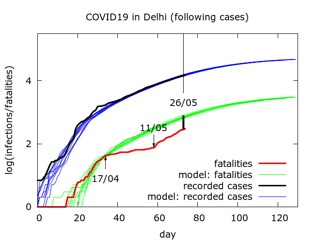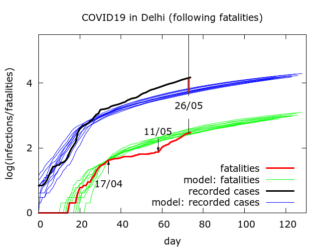 In absolute terms, as of May 27th, we find about 70% more recorded infections than predicted by the model from the fatality data. This would be consistent with a significant increase in case detection. A modest increase in case detection by about 35% would partially explain the discrepancy. If we do the same for Delhi, and “trust” the fatalities we obtain plots like that in Figure 4.