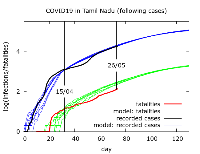 Thus increased testing could explain some of the discrepancy between expected and observed fatalities in both regions. Let’s examine this possibility by “trusting” the fatality figures and using these to predict recorded infections based on a constant case detection rate. If we slightly adjust the parameter values used for simulations of the Tamil Nadu data in Figure 2 so as to match the observed fatality data, we now obtain plots like that in Figure 3.