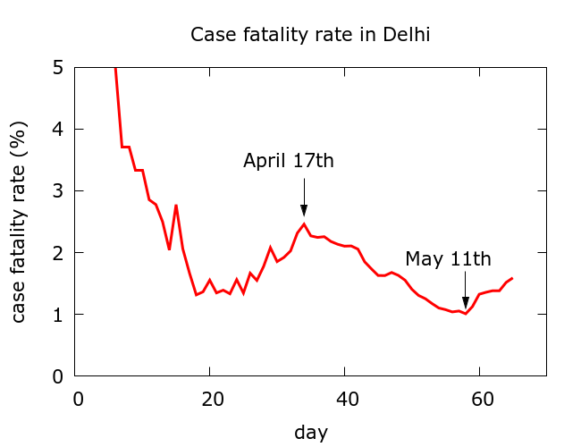The case fatality rate in Delhi. An initial observation involves the case fatality rate (CFR), namely the ratio of total fatalities to total recorded infections expressed as a percentage. The absolute value of the CFR is not very useful by itself, being heavily dependent on testing strategy, and often diverging wildly from the true fatality rate, namely, the infection fatality rate (IFR – the ratio of total fatalities to total infections as a percentage). Nevertheless, changes in the CFR can be a useful indicator of changes in testing strategy, changes in actual fatality, or changes in data recording. The CFR for Delhi is plotted in Figure 1 below. Note that initially the CFR fluctuates because of small numbers of deaths and recorded infections – these stochastic fluctuations are what one would expect in the early days of an outbreak. However, the CFR began a sharp decline around April 17th 2020, when there had been 1707 recorded infections and 42 recorded deaths. This decline began to slightly reverse around May 11th 2020 as seen in Figure 1 below.