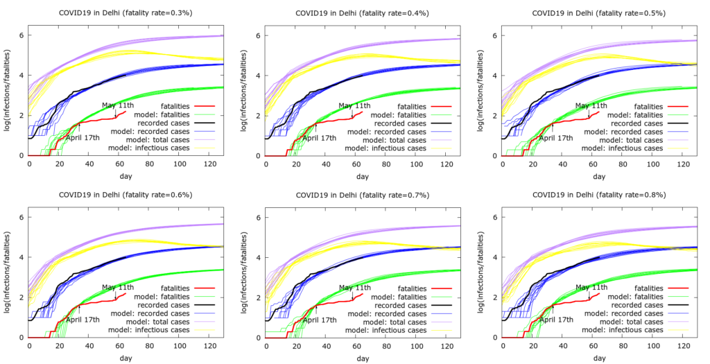 Model estimates of total infection. The model allows us to estimate total and currently active infections in Delhi if we assume a value for the IFR. Model estimates of current infections range from about 150,000 (50,000 currently active) on the assumption of a 0.8% IFR to about 400,000 (150,000 currently active) with a 0.3% IFR. With an intermediate guess of 0.5%, we get about 250,000 infections to date in Delhi of which about 80,000 are currently active. Note that some easing of lockdown is beginning, and with such a significant pool of active infection, cases could easily accelerate again. Thus the model prediction that active infections are currently peaking could prove too optimitic.